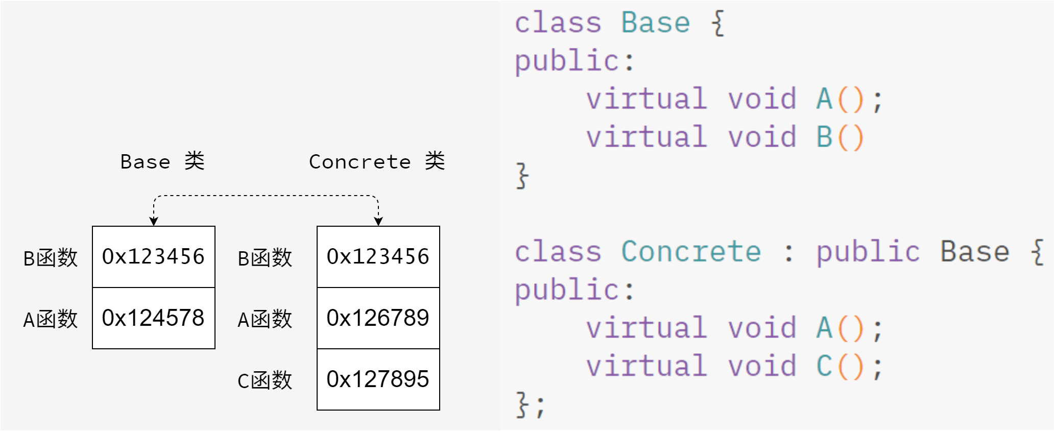 编译器给每个对象添加一个隐藏成员,隐藏成员中保存一个指向函数地址的数组的指针,这种数组就是虚函数表。虚函数表存储为类进行声明的虚函数的地址。如 Base 类,包含一个指针,指向这个虚函数表。派生类也有指向独立地址表的指针,如果派生类提供了虚函数的定义,那么该虚函数表就保存为新的函数的地址,如 A 函数;如果没有定义,就保留基类的虚函数的地址,如 B 函数。
